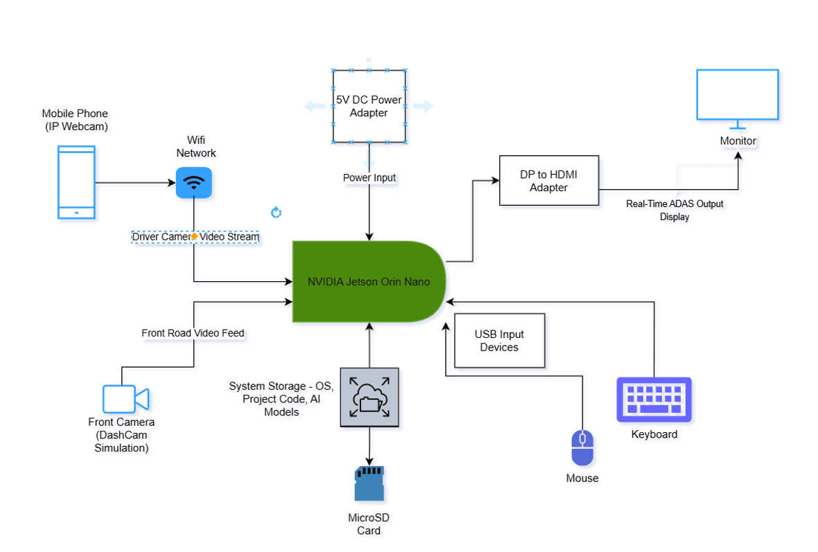 System hardware architecture — NVIDIA Jetson Orin Nano as the central processing hub, connected to a mobile phone IP webcam (driver feed via WiFi), a front dashcam simulation video, a MicroSD card for storage, and a monitor for real-time ADAS output.